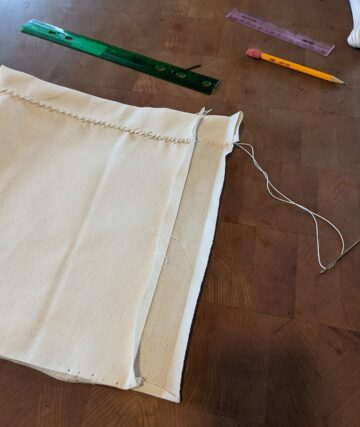 These instructions make a bag that is approximately 12"x 7". One yard of canvas will be plenty for one bag. We did use a sailor's palm a few times to help push the needle through several layers of canvas, but you can also use a few layers of cardboard or leather or a wooden spoon (as long as it isn't special!) to protect your hand if you don't have a palm.