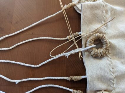 Step 9: Make 6 grommets out of the light line and attach them evenly spaced around the top edge of the bag (check out our tutorial on Hitched Eyelets for more detailed instructions).