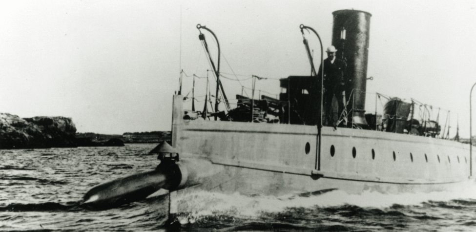Figure 1- The 94-foot STILETTO (WTB-1)- the 118th steam vessel built by the Herreshoff Manufacturing Co. as converted for torpedo boat service. Launching a Howell automobile torpedo from the bow tube c. 1890. (US Navy Photo)