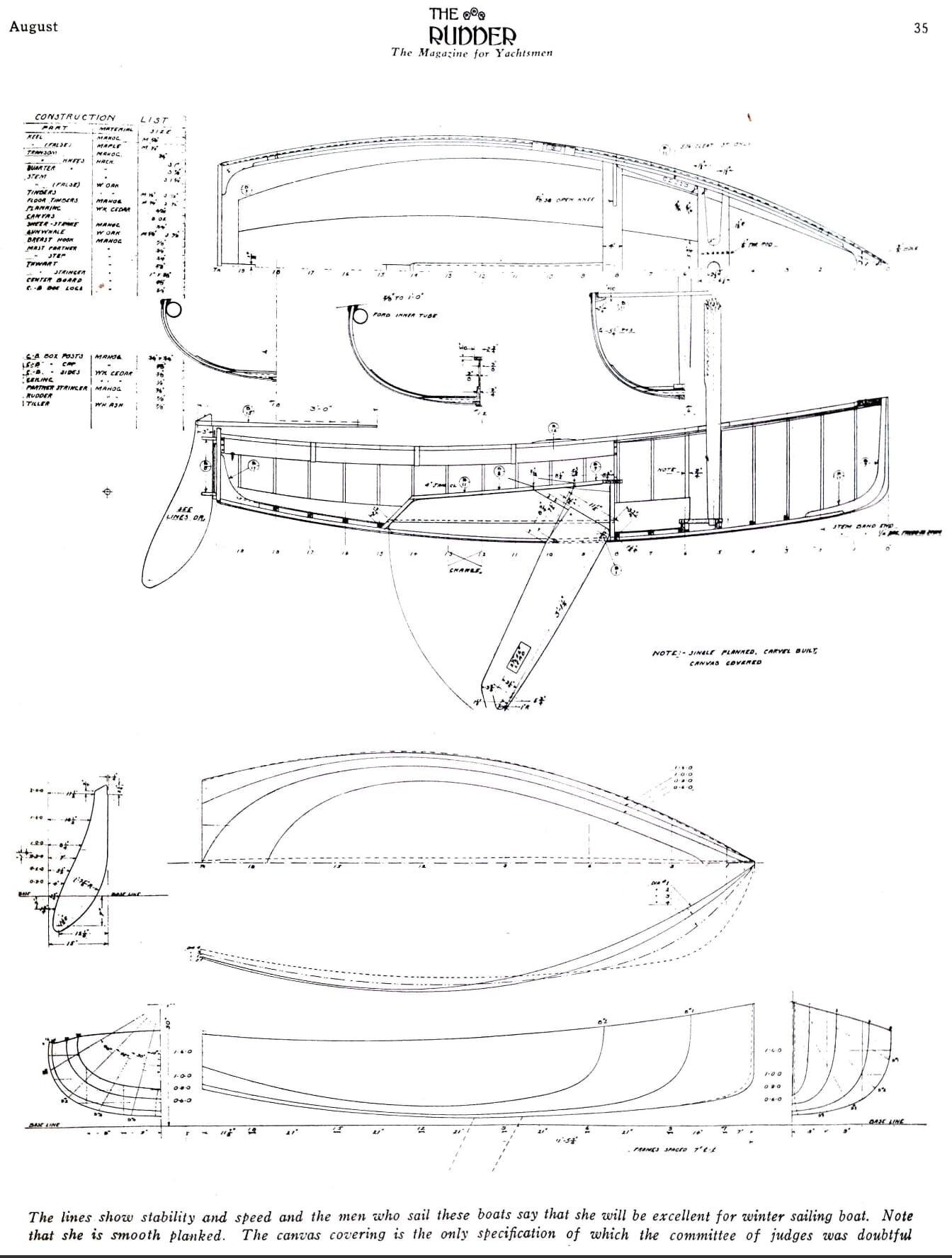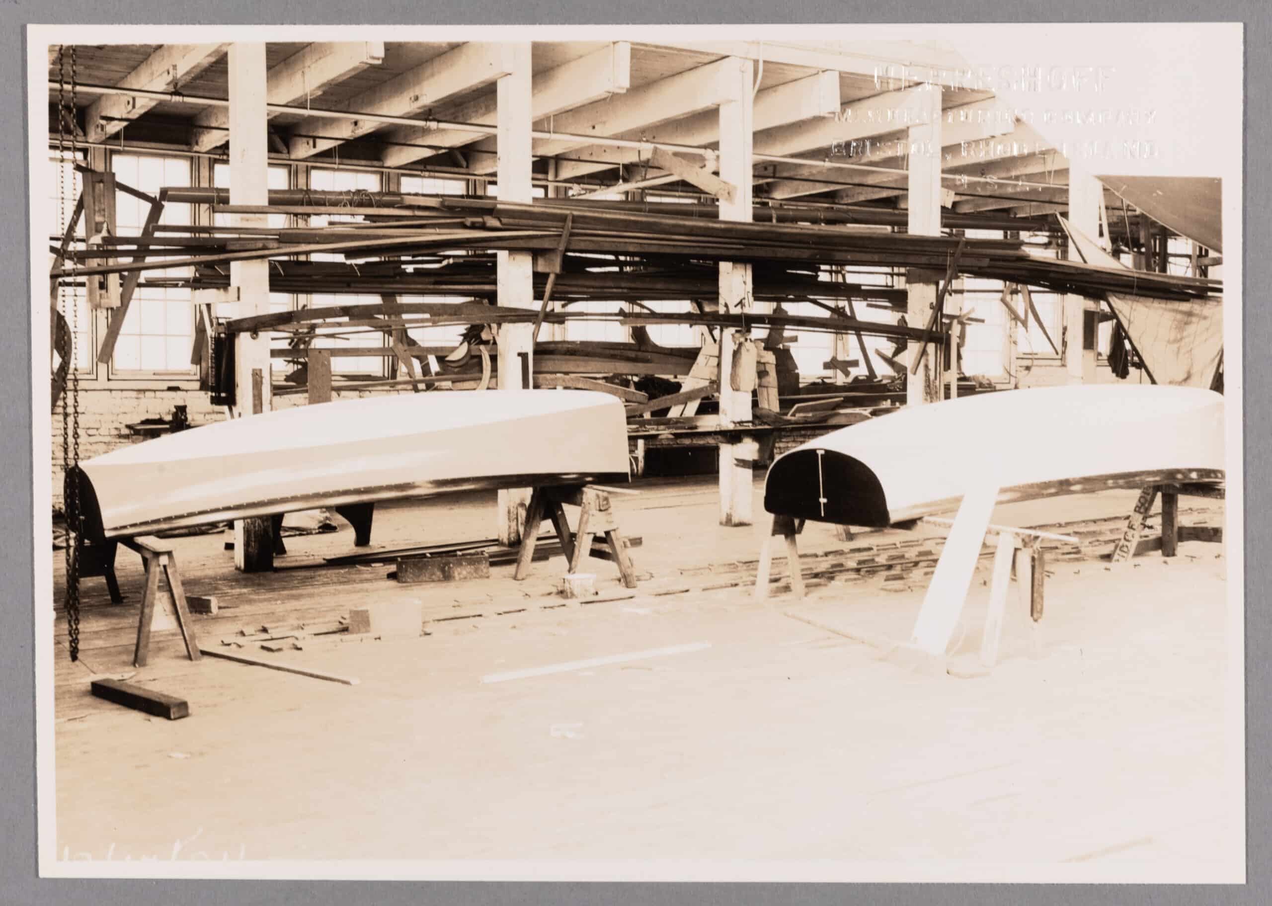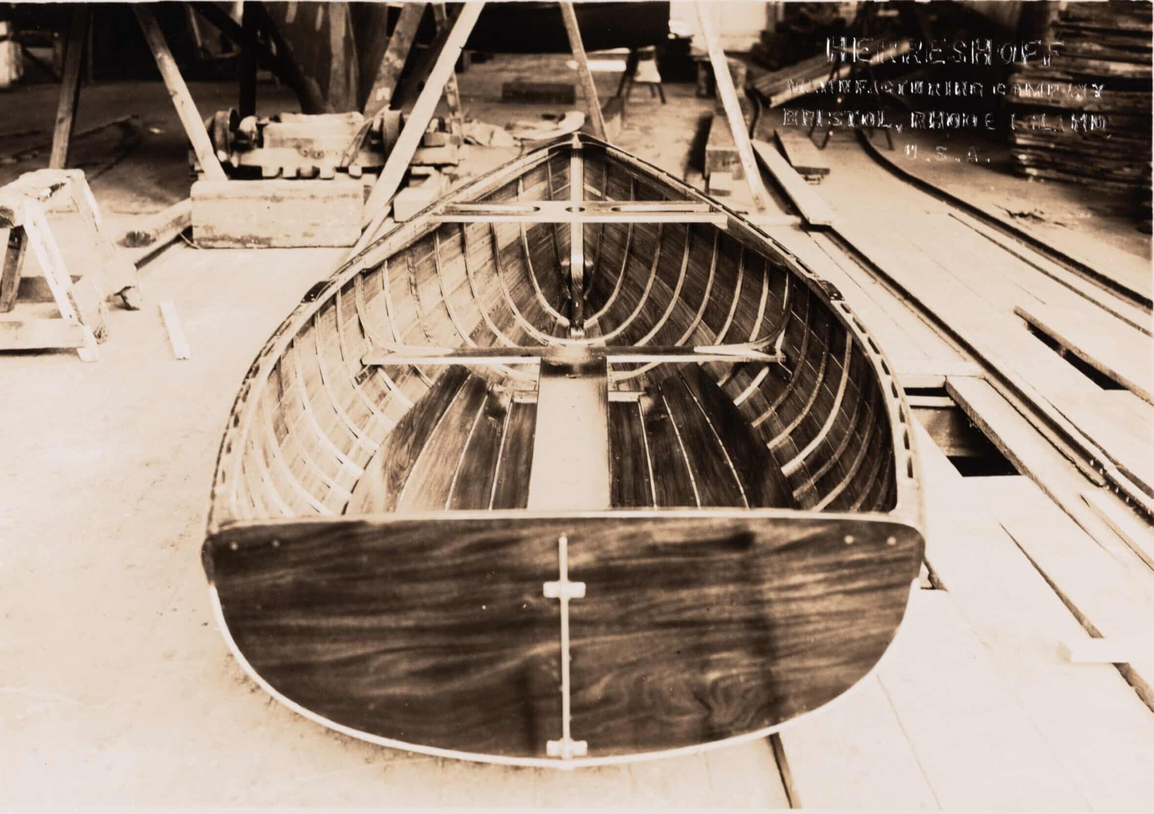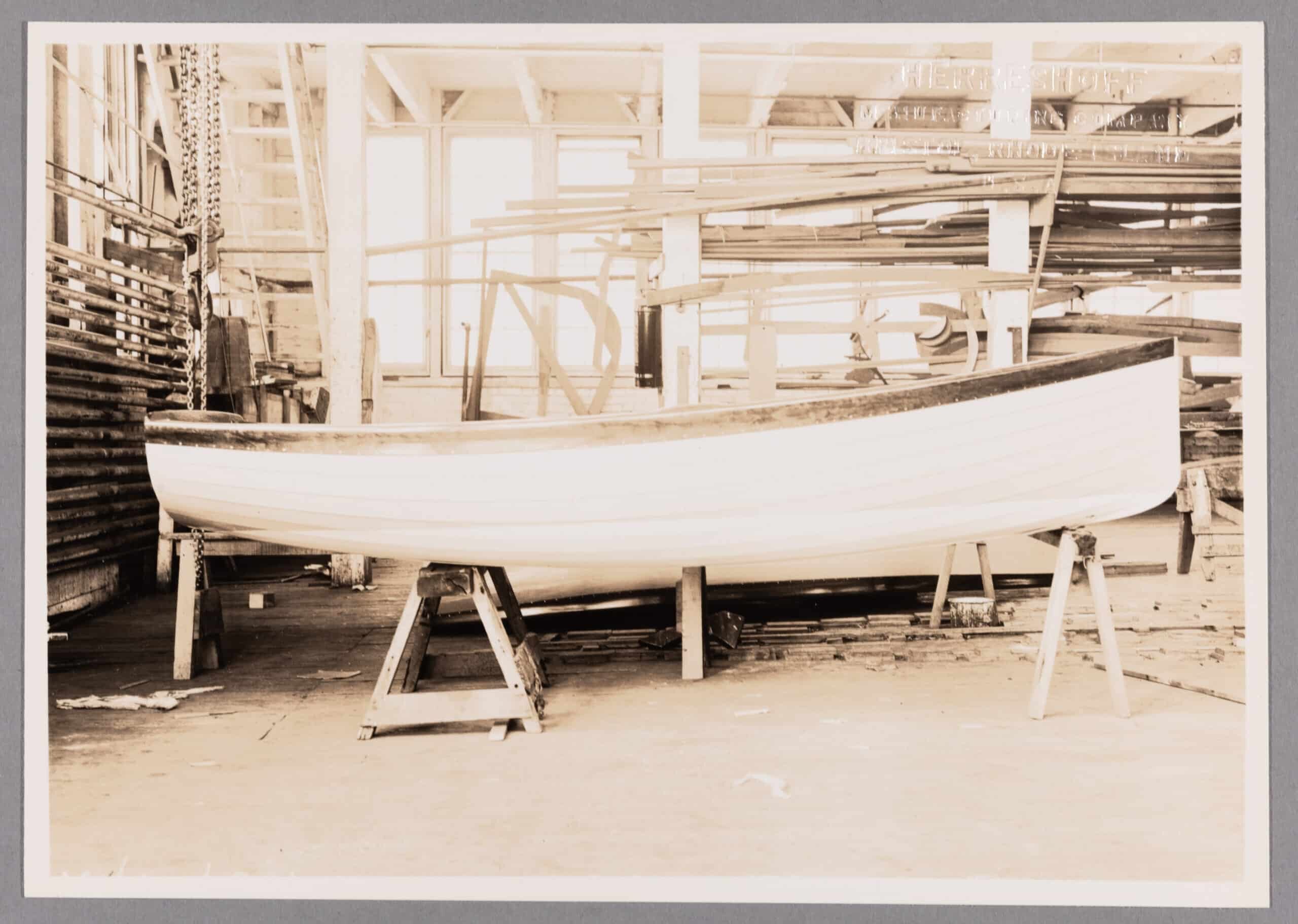 A freshly built Class B Frostbite Dinghy emerged from the Herreshoff Mfg. shop in Bristol on Dec. 3, 1934. Frostbite dinghy racing is not for the faint of heart; after all, who wants to swamp a dinghy in New England in February? Surely, only the most dedicated and competitive sailors! Even so in the early 1930s this mania for dead-of-winter small boat racing swept the East Coast, and soon sent the yachting world into a dinghy design arms race. Rudder Magazine, in an attempt to even the playing field, proposed a competition to select and promote a frostbite one-design. Entries were submitted anonymously, and the winning design announced in the August 1934 issue came from the firm of Potter and Strawbridge, made up of designer Nicholas Potter and yachtsman Bill Strawbridge. HMCo. almost immediately received an order to build 21 of these for $325 apiece. Presumably the company was glad of the business during these lean Depression years, and they bear a resemblance in their construction to both the HMCo. Tech Dinghies and the Amphicraft of the same period. HMCo. wasn’t the only shop to build these B-class dinghies, however; a number were also built in New York, Connecticut, Florida, Texas and California, and the design proved to be both popular and accessible, as Rudder had intended. Amazingly, this little frostbite dinghy had been lovingly cared for by the same family for nearly eight decades prior to its donation to HMM in 2013. It was donated by the children of the late Charles Moody in his memory.