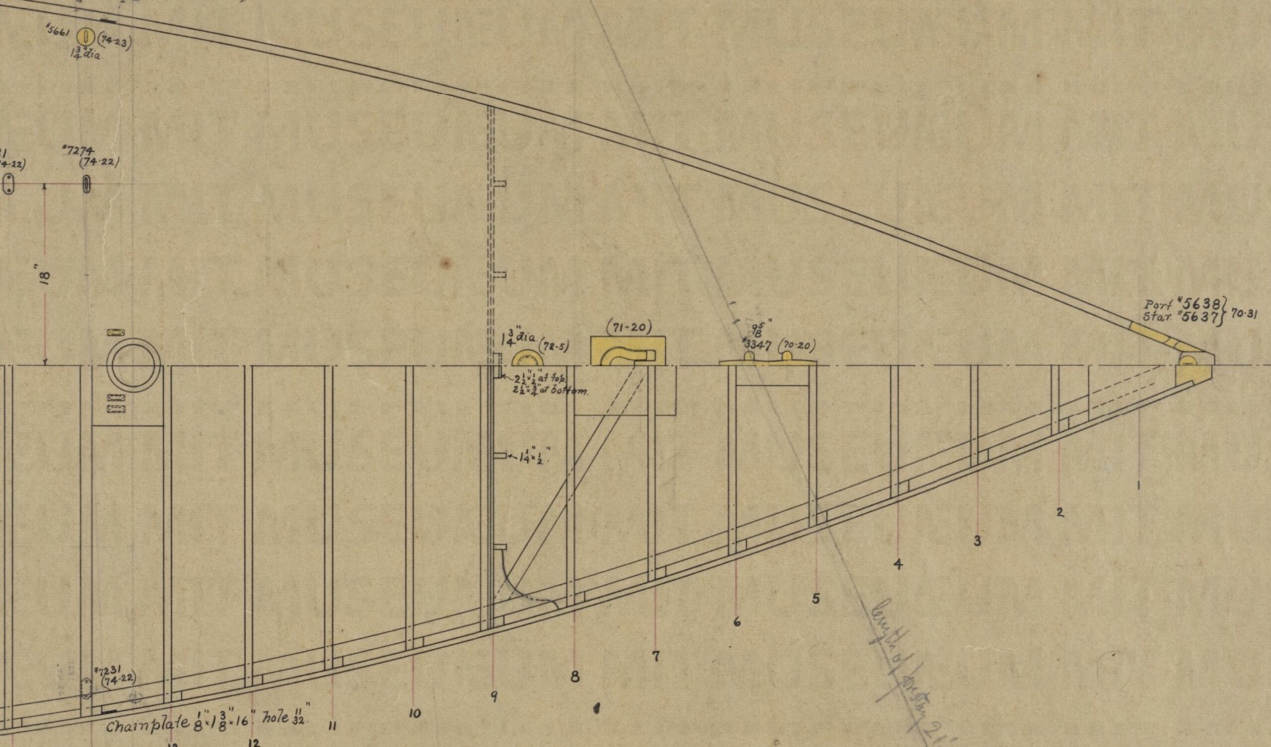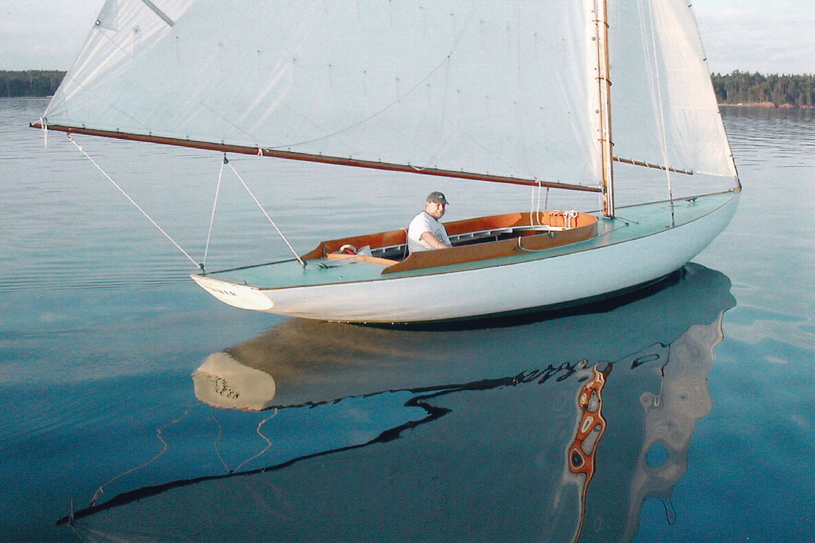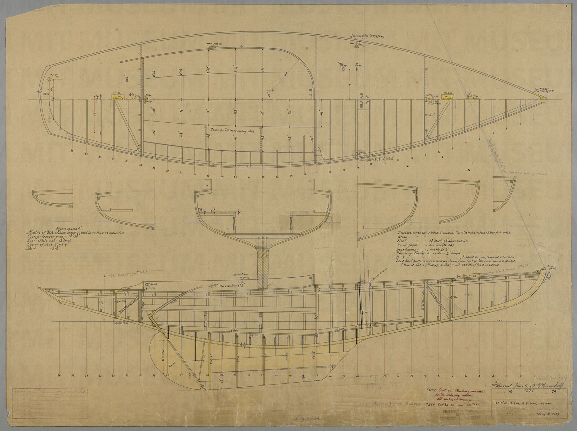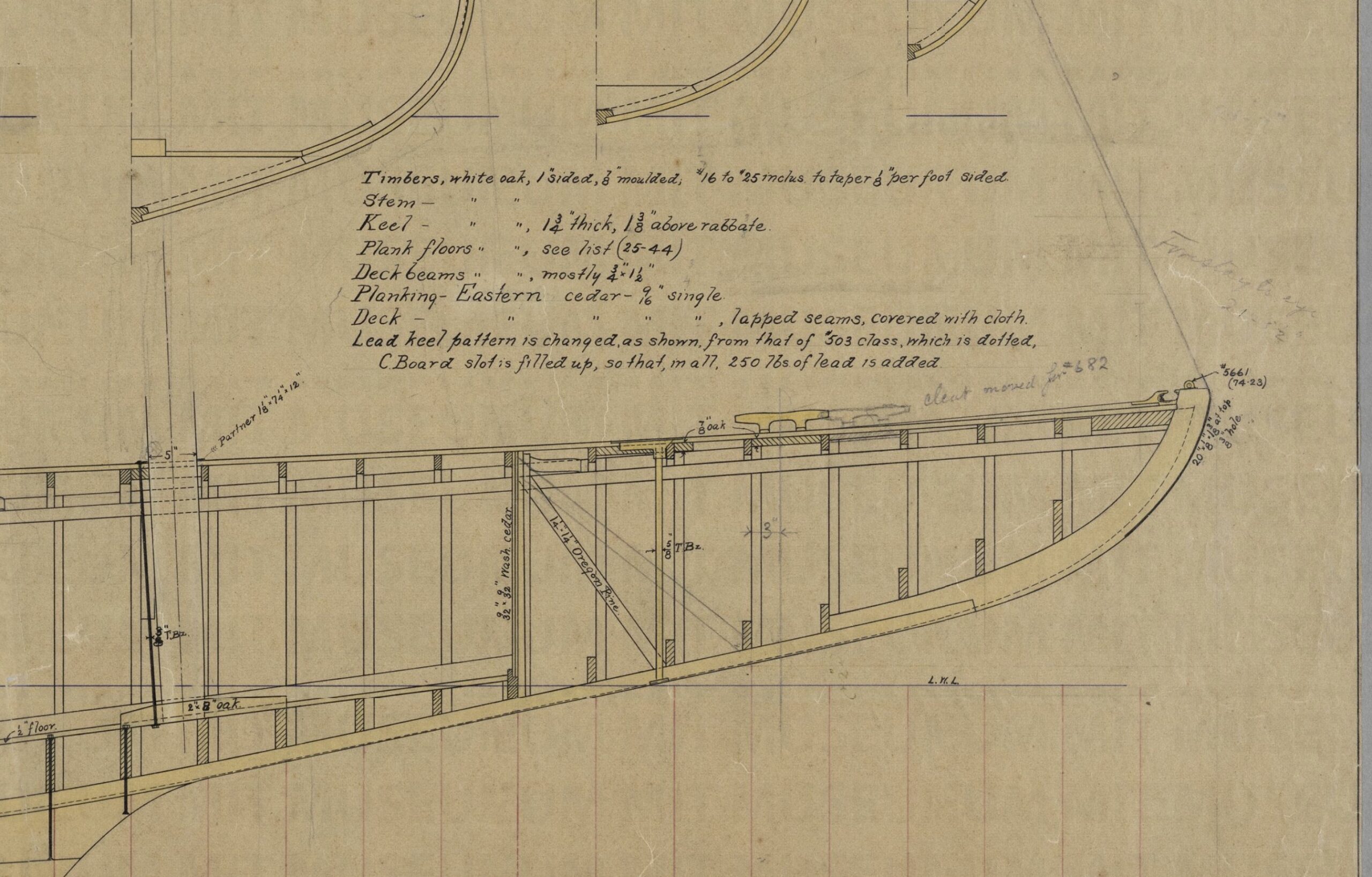 For sailing, Walter Ladd’s crew hastily lowered FLICKER from the steam yacht’s davits, brought her against the landing stage and raised sail. Owner Ladd then climbed aboard and off he went. With husky hoisting shackles recessed into the deck, this is what FLICKER was designed for, rather than racing. N.G. Herreshoff chose to modify his existing Buzzards Bay 15 design by lowering the lead ballast keel, eliminating the centerboard, raising the sheer, and beefing up the structure a little. Correspondence negotiating these changes between N.G. and Mr. Ladd survives in the Herreshoff collection at the MIT Museum today. FLICKER was built as the deepest draft version of NGH’s “15 footer.” While 92 15’s were built with various drafts and keel/centerboard arrangements, only four of these special full keel deep draft versions were ever built. The hull was built to the same molds as the other 15’s with a sheer raised by 2” according to annotations on FLICKER’s original plan. This boat is a spectacularly untouched example of HMCo. workmanship, with original planking, deck, and structural members intact. There are only a few sister frames near the bow, and access panels have been cut through both her watertight bulkheads. Aside from these details not much else has changed since her launch in 1907. You can still see, for example, original pencil marks from her builders on the light lead wash HMCo. used to preserve the interior behind watertight bulkheads. FLICKER was generously donated to the Herreshoff Museum by Maynard Bray in 2019. Her cradle was sponsored by a group of private donors, and her transit from Brooklin, ME was sponsored by Bruce Avery of Mystic, CT.