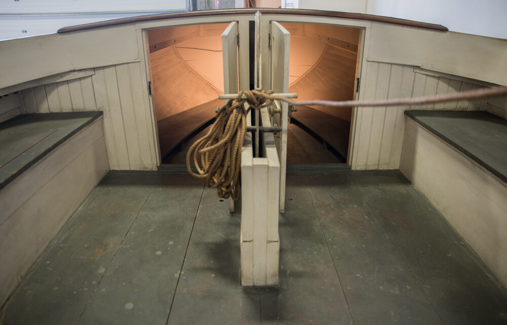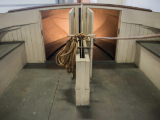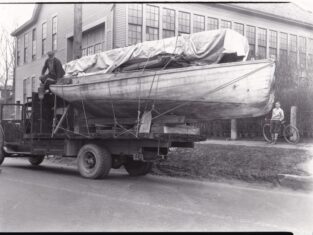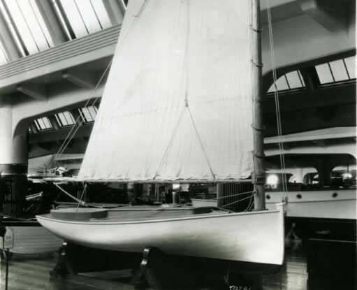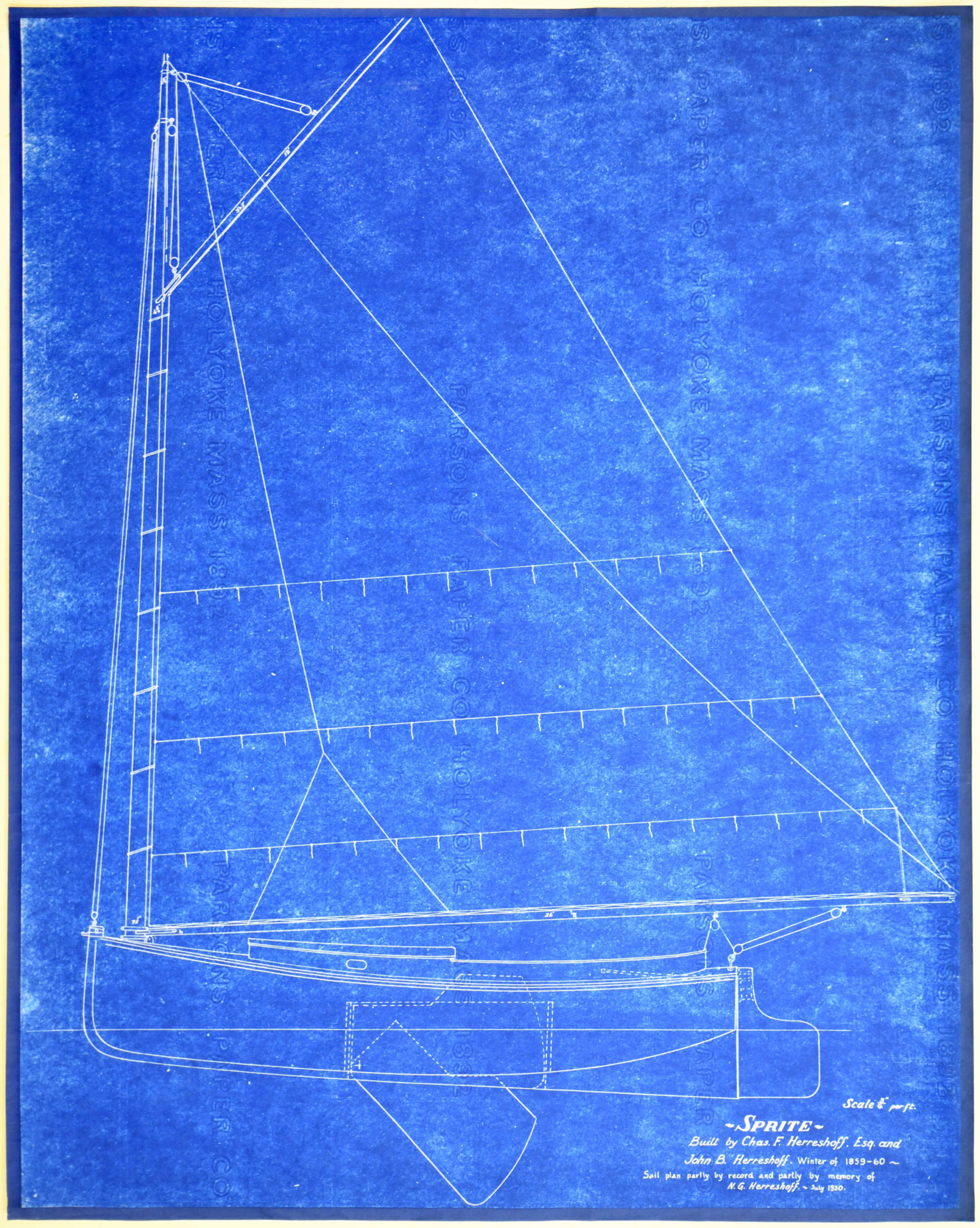 In the summer of 1860, twelve-year-old Nat Herreshoff steered this boat through Manhattan’s East River and its notorious Hell Gate after he and his 18-year-old blind brother, J.B., and a friend had sailed 175 miles from Bristol without stopping. J.B., helped by his dad, had modeled and built SPRITE the winter before, with young Nat helping. The brothers sailed SPRITE together almost daily for three seasons, consistently winning races and cruising extensively to Clinton & New Haven, CT and Block Island & Vineyard Haven, MA. In 1933 at age 85, Captain Nat reflected on the construction of this catboat from his boyhood: “In the fall of 1859, John thought he wanted a larger boat, and he, with my father’s help and advice, made a very perfectly formed model for a twenty foot boat which was destined to be named SPRITE. At the age of eleven and one-half, I had the job of cutting templates to fit the model, and from these, drawing out sections where frames (not timbers) were to be, and measuring them and [drawing] profile[s] from the model at one-twelfth its size. I also remember well going to Fall River (Massachusetts) in METEOR, with John, and walking out to a sawmill that was near a cedar swamp some three or four miles east of Fall River and ordering the cedar boards to be sawed for planking etc. There was a stiff nor’wester that day and we got thoroughly wet both ways. This cedar was delivered in Bristol by the steamer BRADFORD DURFEE and was of excellent quality. A trip in METEOR was made to Warren (Rhode Island) and we brought back from the shipyard there some oak for the centerboard logs on [METEOR’s] deck and [more oak for] the keel in tow. We borrowed my brother Charles’ twenty-two foot cat boat YANKEE to go to Wickford to get oak for timbers and sheerstrakes etc. This must have been in October. William Allen Manchester, an old boat builder of the town, and a fine workman, consented to help John to build SPRITE. He started with the keel, and had the centerboard logs and posts ready to assemble when he died from a heart attack. This was quite a shock to John and me. After a while, my father consented to help John build the boat, and the work Mr. Manchester had done in his own shop on Constitution Street, near Thames Street, was moved to the “Old Tannery,” across from my father’s house. SPRITE was set up in the west part over the floor that was partitioned off and heated as already described. Her growth was slow, but the work in her was very carefully done and the material was of the best. In the spring, Thomas J. Thurston, another old boat builder, assisted for a while. The town’s famous old sailmaker, Jonathan Alger, made her [main]sail and light jib. The sail was of hard woven Colt’s Duck 8 oz., 22 inches, with one middle bight sewn. Jonathan Waldron, the town’s blacksmith, forged the block straps and other parts from copper and the anchor from iron. My father made the block shells and John turned the sheaves from lignum-vitae. John and my father did nearly the entire work, and I helped a little between school hours. The boat was completed and launched June 28th 1860 – the day the steamer GREAT EASTERN arrived in this country – and she was rigged and tried just at dusk that day. John laid up all the running rigging etc. of cotton – spinning up cotton twine for the purpose…” (Excerpted from “Recollections: and Other Writings” by Nathanael G. Herreshoff)