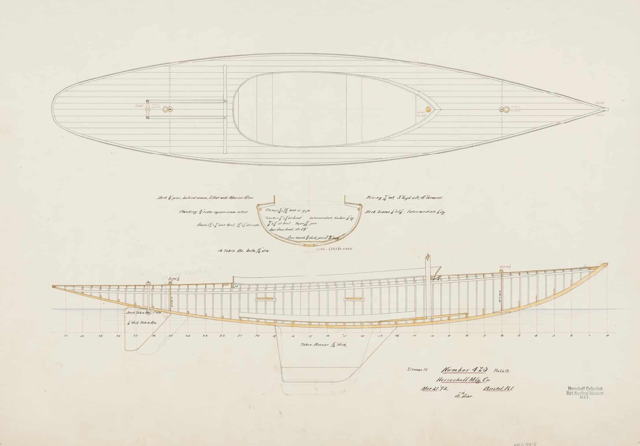 WEE WINN was a radical and futuristic design in 1892. With its bronze plate – essentially a fixed centerboard – and lead bulb keel, WEE WINN is totally unlike any other vessel on display in the HMM collection today. HMCo. built almost 50 fin keel boats between 1891 and 1900, ranging from 20 to 65’ feet in length. The half models for these boats are immediately recognizable on the south wall of the N.G.H. Model Room because they appear not to have any keels at all! Because the keel was a thin bronze plate bolted to the bottom of the hull, there was no reason to include it in a carved model. The shape of the lead bulb fastened to the bottom of the plate was very significant to the boat’s performance, however, and if you look closely at the top of Captain Nat’s roll top desk in the northwest corner of the model room you can see a whole selection of carved half models for these lead bulbs. WEE WINN was owned and raced on the Solent in the U.K. by Miss Winifred Sutton. She and her sister Maude were both avid sailors, and in WEE WINN’s first racing season, Miss Sutton took 20 first places and 1 second place in a total of 21 races. Miss Sutton’s decision to go to an American yacht designer in 1892 may have been influenced by her brother’s experience attempting to race against American yachts just a few years prior: in 1885 Sir Richard Sutton had challenged for the America’s Cup – and was soundly beaten by the Yankee boat.